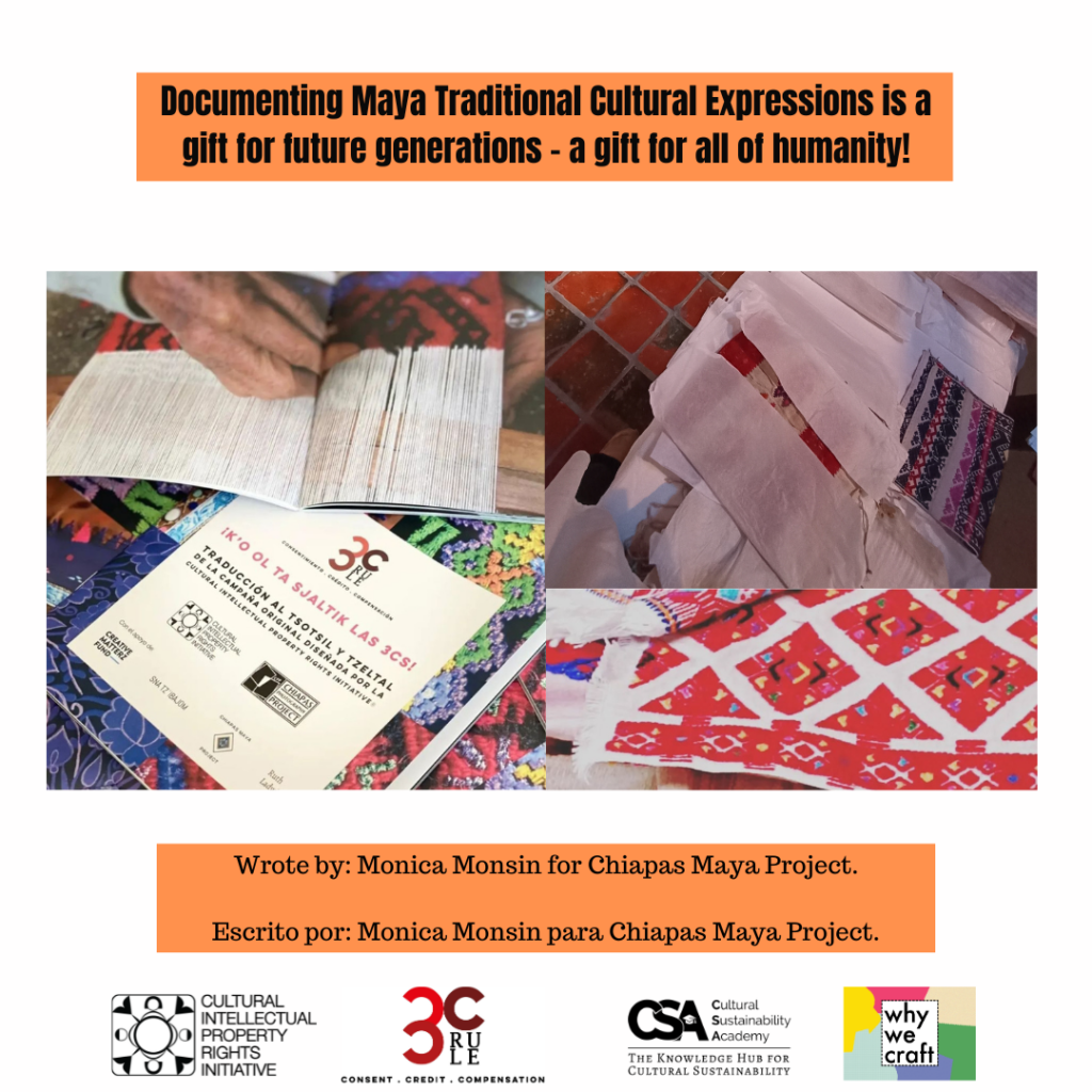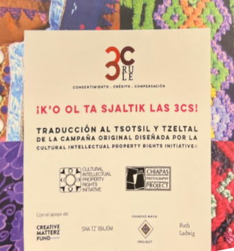 El Cultural Intellectual Property Rights, desarrollo una campaña llamada: Regla de las 3C s: Consentimiento, Crédito y Compensasión; para evitar la apropiación cultural indebida y promover mejores prácticas colaborativas (sobre todo dentro del mundo de la moda sostenible), con la campaña se busca promover y difundir terminología apropiada basada en legislaciones internacionales sobre propiedad intelectual y el uso de Conocimientos Tradicionales y Expreseiones tradicionales de pueblos indígenas y comunidades locales. Ésta campaña ha sido traducida a varios idiomas, entre los que destaca el Tsotsil y Tseltal (dos de las lenguas Mayas, mayoritariamente habladas en Chiapas), a partrir de ésta traducicción CIPRI y otras actoras de cambio sistémico dentro del entorno textil en Chiapas han continuado trabajando en conjunto. La regla de las 3Cs en tostil y tseltal, se imprimió para su socialización con Organizaciones, Colectivas y Mujeres tejedoras durante el 2022, el resultado de la socialización se puede revisar en el siguiente link: Reporte de la socialización.